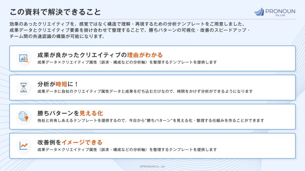 効果のあったクリエイティブを、感覚ではなく構造で理解・再現するための分析テンプレートをご用意しました。