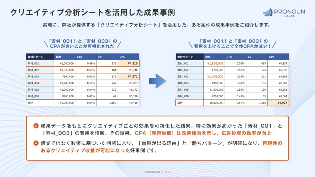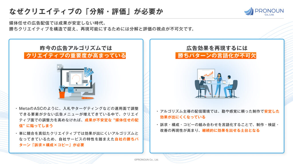 成果データとクリエイティブ要素を掛け合わせて整理することで、勝ちパターンの可視化・改善のスピードアップ・チーム間の共通認識の構築が可能になります。